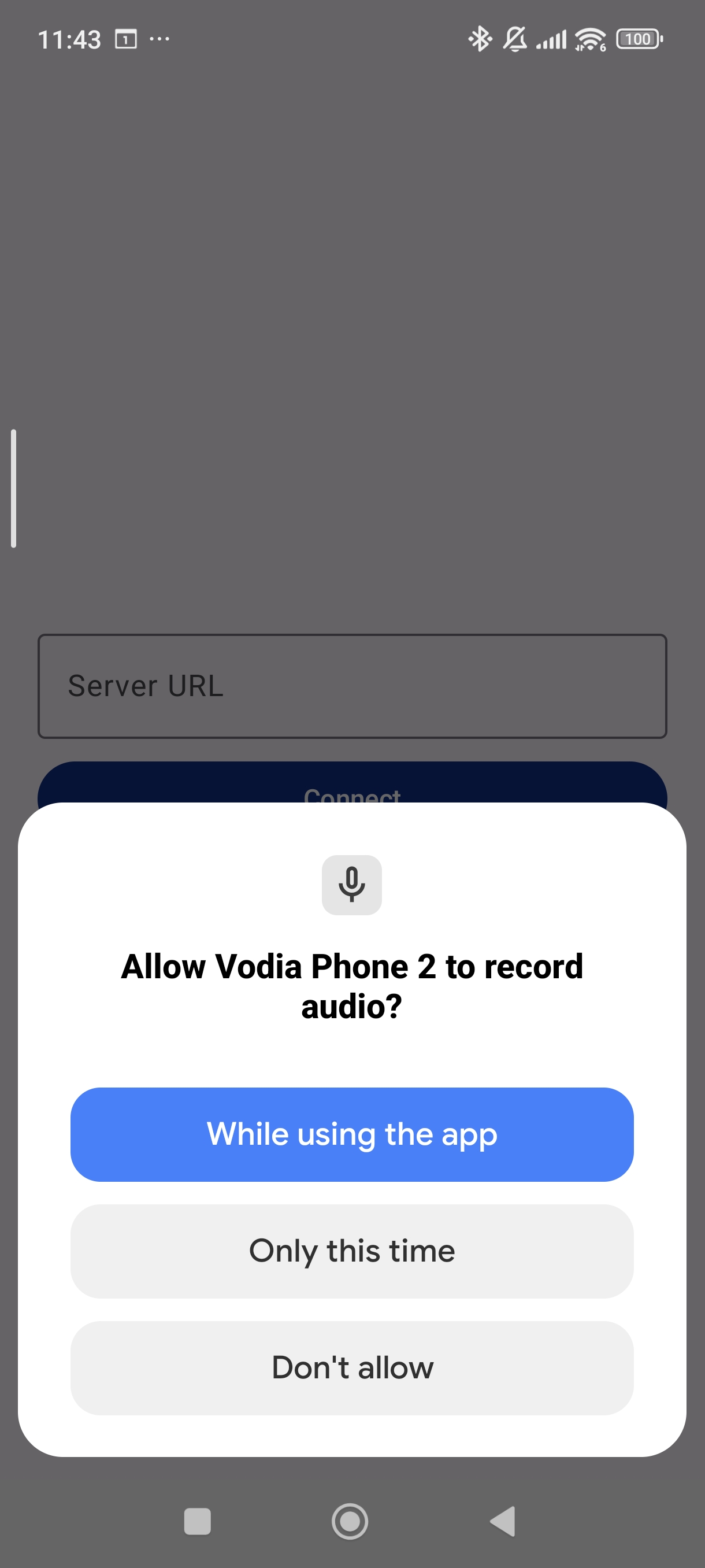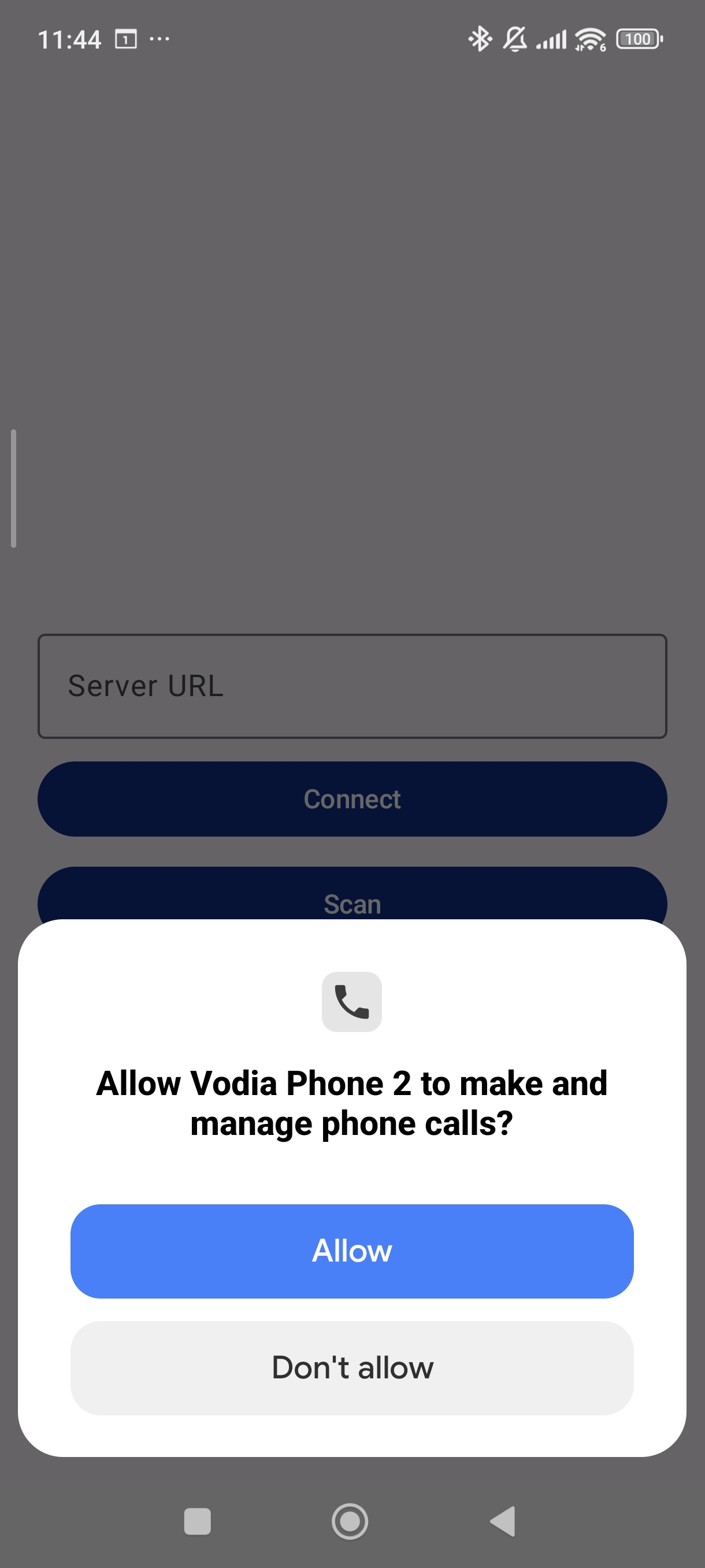 Calling Permission - This is critical as Vodia Phone 2 integrates with Android's Telecom Manager and makes use of the native dialer in the phone. This allows you to freely use Bluetooth features and Android Auto with the app. Once you enable the calling permission, hit the back button.